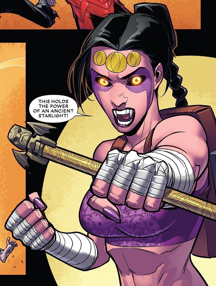 Reprezentantka Warriors of the Great Web, rozbitek z Earth-616. Po upadku multiwersum wylądowała w Arachnii. Mając mgliste wspomnienia dawnego życia, została zwerbowana przez Paviitra Prabhakara i dołączyła do Web Warriors, drużyny Pająków, która poszukując prawdy o ich pochodzeniu, weszła w konflikt z burmistrzem Normanem Osbornem, baronem Arachnii. Wspólnie z towarzyszami odkryła Siege Perilous, maszynę mającą obdarzyć prezesa Ozcorp boską mocą. Po obaleniu psychotycznego barona pozostała w grupie, która odtąd miała strzec Arachnii.