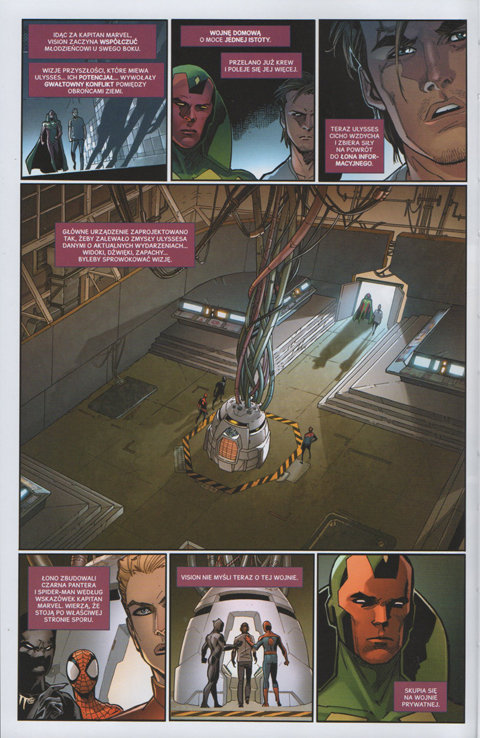 Zacznijmy od nazwy. II Wojna Domowa sugeruje, że poznamy to wielkie wydarzenie z perspektywy nowo powstałej drużyny. Dowiemy się jak do tego podchodzą, po której stronie stają i jakie w związku z tym przygody mają jej członkowie. Tak się nie do końca dzieje. Poznajemy punkty widzenia Vision, nowej Wasp oraz Thor. Pozostali członkowie zostali pominięci, a przecież wiemy z II wojny Domowej, że ogromną rolę odgrywa w niej zarówno Iron Man jak Spider-Man (Miles Morales) – tymczasem ich tutaj nie uświadczymy. Pająka jest jak na lekarstwo. Gdzieś tam, w pojedynczych kadrach go znajdziemy. To samo tyczy się oryginalnego Spider-Mana (Petera Parkera). Został tu poruszony ciekawy wątek, który mógł być (a nie był) poruszony w Amazing Spider-Man: Wojna Domowa. Otóż okazuje się, że nasz Pajączek pomógł budować coś w rodzaju wzmacniacza mocy Ulyssesa. A do Milesa jeszcze wrócę.