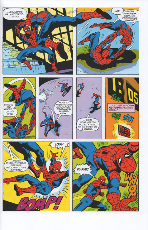Rozterki Petera są w tej historii mocno uwypuklone. Przeszkadzają w toczeniu pojedynków i w efekcie czego nawet nie stanowiący zagrożenia dla Pająka przeciwnicy zdają się zyskiwać przewagę. Intryga Jackala nabiera tempa, aż do chwili pojawienia się na stadionie Shea, gdzie Spider-Man stoczył pojedynek z sobą samym. I tu rozpoczynamy otwartą na wiele lat furtkę. Czyli najważniejsze pytanie: który Spider-Man jest prawdziwy? Oboje posiadają takie same wspomnienia i wrażenie bycia oryginałem. A sam czytelnik też nie może być niczego pewien. W końcu kadry przeskakują między jednymm, a drugim i nie mamy żadnych wskazówek. Pomimo zwycięstwa nad Jackalem i poddaniu się testom u Connorsa, scenarzysta finalnie pozostawia nam otwartą furtkę, by żyć w niewiedzy. Peter pozbywa się wyników badań nie chcąc znać prawdy, własna pewność mu wystarczy. Pytanie tylko, czy nam też?