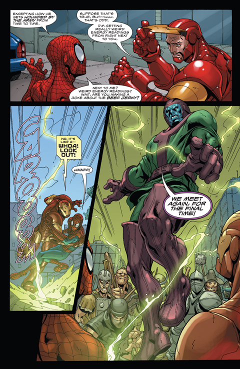 Po załatwieniu sprawy z opryszkami bohaterowie ruszają w stronę samolotu, ale wtedy Iron Man wyczuwa energię nieznanego pochodzenia tuż obok Spider-Mana i po chwili pojawia się w tym miejscu Kang. Zachowuje się on bardzo dziwnie i twierdzi, że spotykają się ponownie, podczas gdy bohaterowie widzą go po raz pierwszy. Spidey i spółka dają sobie radę z jego ludźmi, więc Kang decyduje się na powrót tam skąd przybył.