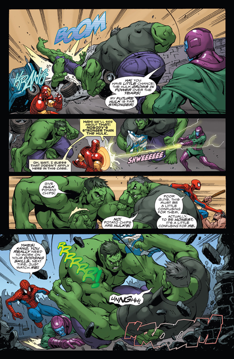 Bohaterowie nie otrząsnęli się jeszcze po wizycie Kanga, a już po chwili w tym samym miejscu pojawia się kolejna postać. Tym razem jest to Iron Man pochodzący z przyszłości, w której światem rządzi Kang. Stało się tak za sprawą chipsów, w których została użyta technologia czasowej pętli. Powodują one reset czasu, który w praktyce polega na tym, że gdy zjada się takiego chipsa to zaraz zostaje się zmuszonym do powtórzenia tego procesu. Dzięki temu Kang dorobił się na tych chipsach fortuny i teraz nie tylko rządzi światem przyszłości, ale zaczął się także cofać w przeszłość i podstawiać swoje chipsy na półki sklepowe, tak że jedynymi nie skażonymi bohaterami pozostają Spider-Man i Iron Man. Hulk zdążył zjeść kilka paczek chipsów, zanim przybył do nich Tony z przyszłości.