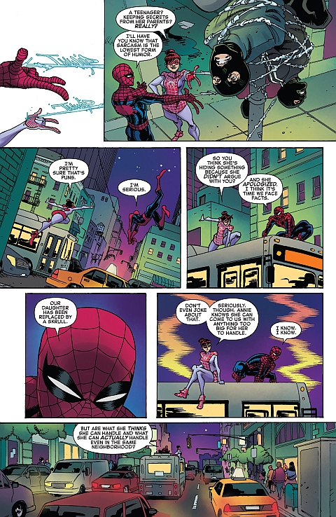 Na pewno komiks zasługuje na pochwałę za scenę rozmowy Petera i Mary Jane podczas patrolu. Zdecydowanie im więcej małżeńsko-rodzinnych interakcji między tą dwójką (wszak córka nie zawsze musi im towarzyszyć), tym większa różnorodność i wyższy poziom całej serii. Zasadniczo chyba jedynym mankamentem komiksu było zbyt szybkie rozładowanie zbudowanego w poprzednim numerze napięcia między ojcem-nauczycielem (Peter) a córką-uczennicą (Annie). Trzeba było ten temat jeszcze trochę pociągnąć. Oby jednak wątek problematycznej pracy Parkera nie wygasł na dobre.