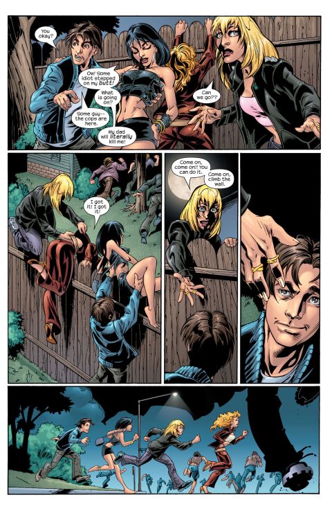 Zebrani na imprezie z radością przyglądają się płonącym autom, które wysadził niejaki Geldoff. Po chwili odzywają się policyjne syreny i wszyscy rzucają się do ucieczki. Gwen i Peter trafiają na Mary Jane i Liz. Na przystanku przyjaciele intensywnie dyskutują o tym, co się stało. Od dziewczyn z innej szkoły dowiadują się, że Geldoff to student z wymiany. Następnie w czwórkę ruszają autobusem w stronę Queens.