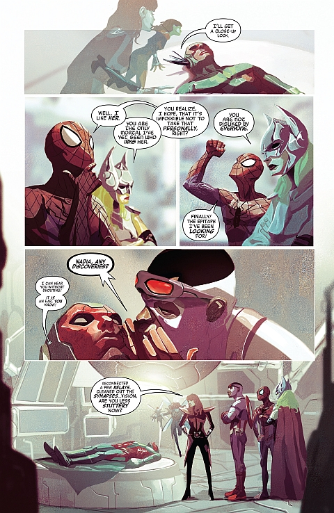 Parker Industries. Robiąc użytek z miejscowej aparatury, Nadia Pym pomaga naprawić Visiona. Zreperowany android przyznaje, że atak Kanga był odwetem za porwanie przez niego dziecka, czyli Kanga w wieku niemowlęcym. Robot chciał w ten sposób zapobiec powstaniu zbrodniarza, ale ponieważ ten jest królem paradoksów, cel nie został osiągnięty. Cap ma pretensje do Visiona, że ten ani słowem nie zająknął się o tym planie. Android zdradza, że informacje o miejscu ukryciu dziecka „przerzucił” na zewnętrzną bazę danych.