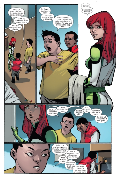 Brooklyn Visions Academy. Miles Morales przyprowadza Marvel Girl do pokoju, jaki dzieli z Gankiem Lee w akademiku. Opowiada współlokatorowi o dziewczynie, która potrafi czytać w myślach i tworzyć iluzje. Miles prosi kumpla o wypożyczenie samochodu jego matki, gdyż w planach mają podróż do odległego Westchester. Kiedy młoda Jean Grey bierze prysznic, Morales wysyła do kogoś e-maila z prośbą o pomoc.