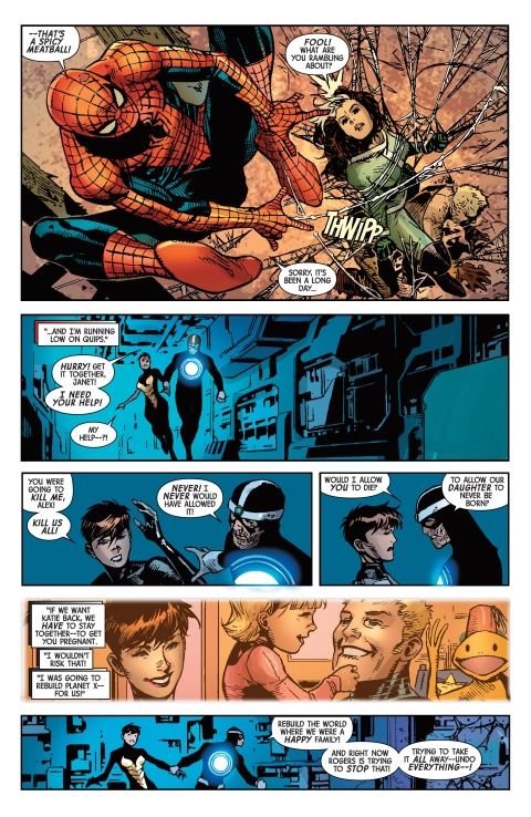 Manhattan. Wasp z troską w głosie pyta Havoka, jak się czuje. Cage przekonuje się, że Sabretooth pozostał szlachetnym człowiekiem, w przeciwieństwie do męża Wasp, który bierze Janet za zakładnika i grożąc jej śmiercią zmusza ją do zabrania ich w mikroświat. Steve Rogers jest przejęty uprowadzeniem Wasp przez zdeprawowanego Havoka. Magneto zwraca uwagę, że powinni bardziej przejmować się zniknięciem Iron Mana, Doctora Dooma i Red Skulla.