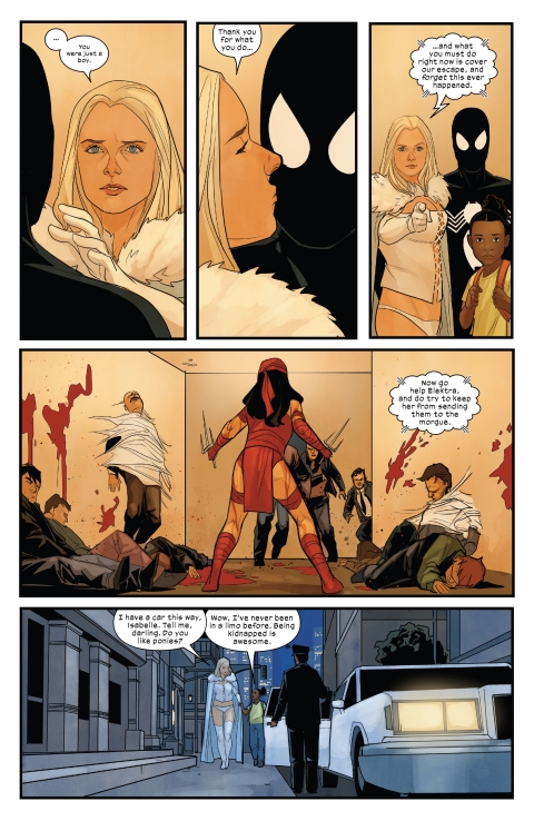Frost i Elektra trafiają do mieszkania świadka – Isabelle. Emma bada umysł dziewczynki i poznaje całą prawdę. Elektra słyszy zbliżających się policjantów na usługach Fiska. W poszukiwaniu wsparcia Frost przywołuje przelatującego obok Spider-Mana w czarnym kostiumie. Telepatycznie czyta umysł superbohatera, dziękuje mu i „sugeruje”, by pomógł Elektrze w walce, a potem zapomniał o sprawie.