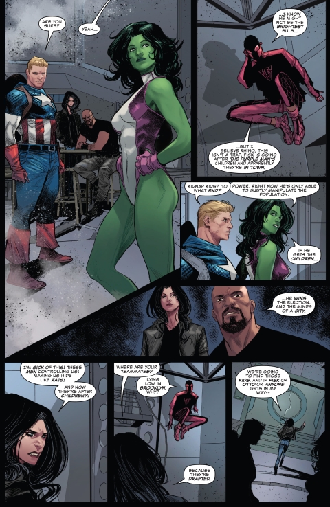 Avengers Mansion. Spider-Man przekazuje Avengers informacje od Rhino i zapewnia Kapitana Amerykę, że to nie pułapka. Luke Cage i She-Hulk uznają, że jeśli Fisk przejmie kontrolę nad dziećmi Purple Mana, zdominuje całkowicie umysły mieszkańców i zwycięży w wyborach. Jessica Jones postanawia działać – werbuje Champions do wspólnej misji ratunkowej i przejmuje nad grupą z Brooklynu dowodzenie.
