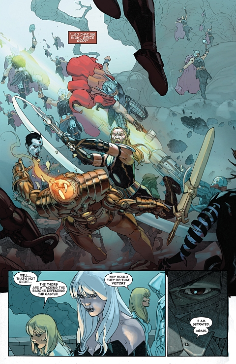 Punktem zwrotnym w fabule tego komiksu, a kto wie, czy nie całego crossoveru, jest rozpad Thor Corps na dwa bloki: gwardzistów wciąż lojalnych wobec władcy Battleworldu i wojowników, którzy stracili w niego wiarę i postanowili dołączyć do koalicji pragnącej strącić go z tronu. Tak oto na naszych oczach upada jeden z filarów, na jakich zbudowano system polityczny świata rządzonego żelazną ręką przez Dooma.
