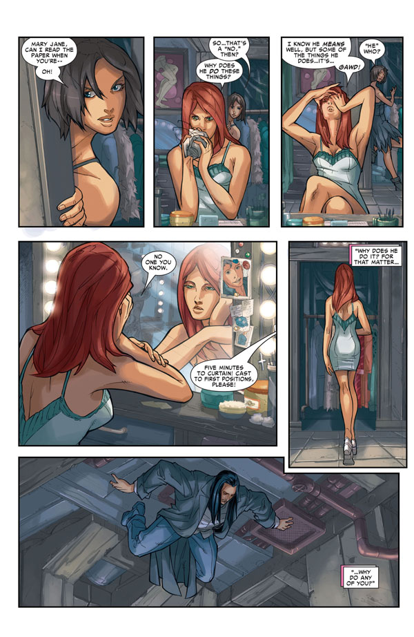 Teraz. Kończy się sztuka, wielki fan MJ wykrzykuje komplementy. W garderobie aktorki rozmawiają na jego temat, to piętnasty raz gdy widzi on sztukę. Nagle ktoś woła z innego pokoju krzycząc, że w TV pokazują jak Tracer zaraz zabije Spider-Mana. Kłócący się mężczyźni, którzy to oglądają nie wiedzą gdzie jest pilot i nie mogą zrobić głośniej. MJ zdenerwowana wybiega. Mężczyzna prosi o autograf, kiedy MJ mu odmawia ten, wyzywa ją. Największy fan MJ, Johnny uderza mężczyznę w głowę krzycząc „Nie obrażaj jej!”. Pojawia się Morlun, który mówi Johnny’emu, gdzie pobiegła MJ.