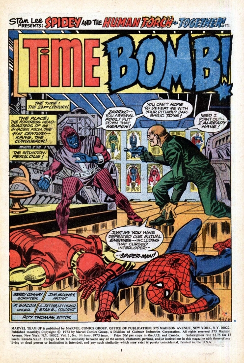 Kłopot polega na tym, że został uszkodzony zasilacz zbroi Irona, który przez to nie może się poruszać. Spidey przechodzi niepostrzeżenie do innego pomieszczenia, gdzie znajduje się wehikuł czasu. Parker zauważa, że data na wehikule ustawiona jest na 14 lutego 1973, więc nie pozostaje mu nic innego, jak odpalić maszynę. Wśród sprzeczających się Kanga i Zarrko pojawiają się tajemniczy goście. Okazuje się, że Spidey wylądował w laboratorium Reeda Richardsa. Pojawienie się Parkera zauważa jedyny obecny Johnny Storm, któremu po krótkiej chwili Spidey wszystko opowiada. Postanawiają, że Human Torch zajmie się pociskiem zlokalizowanym w Japonii, natomiast Spider-Man pociskiem z Ameryki Południowej.