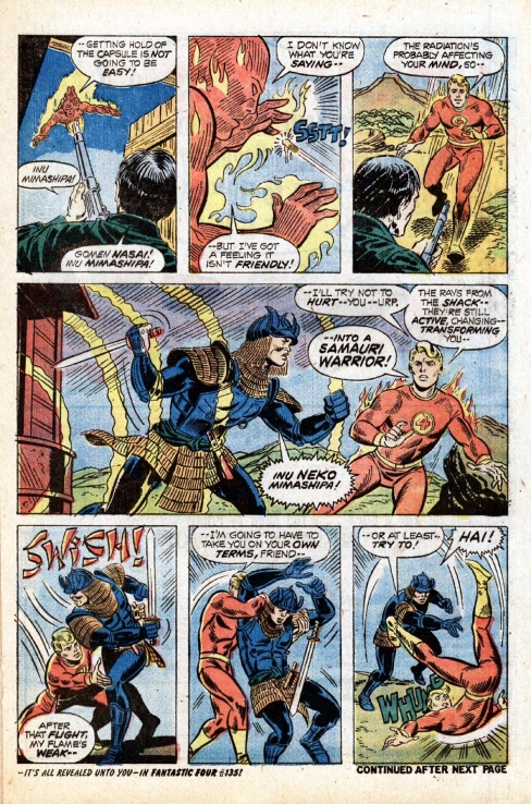 Johnny w Japonii rozmyśla, gdzie bomba może się znajdować, gdy nagle zauważa, jak pociąg zmienia się w lokomotywę parową. Po chwili cały kraj zaczyna się zmieniać i młodnieć. Torch po kierunku promieniowania udaje się do centrum jego emisji w jednym z domów. Kiedy tam dociera, pewien mężczyzna celuje do niego ze strzelby, lecz po chwili zmienia się w dawnego wojownika samuraja. Osłabiony lataniem Torch musi radzić sobie bez ognia. Po krótkiej walce na pięści Torch nokautuje przeciwnika, po czym odnajduje bombę czasową. Niestety, jej promieniowanie zaczyna wywierać wpływ także na niego.