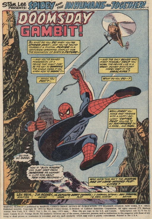 Komiks rozpoczyna się kolejną dziurą fabularną. Ostatnio widzieliśmy Pająka, jak w Grecji rozbroił ostatnią bombę czasową. Tutaj zastajemy go, jak przyczepiony do helikoptera leci w Himalaje z zamiarem odszukania siedziby Inhumans. Przypominam, że Storm zostawił go bez żadnej pomocy ani wskazówki co do lokalizacji tej grupy. Ponadto, jak Spidey znalazł w Grecji amerykańskiego pilota, który za darmo zgodził się przewieźć go z kontynentu europejskiego do Azji, w bardzo odległy i nieprzyjazny klimatycznie rejon?