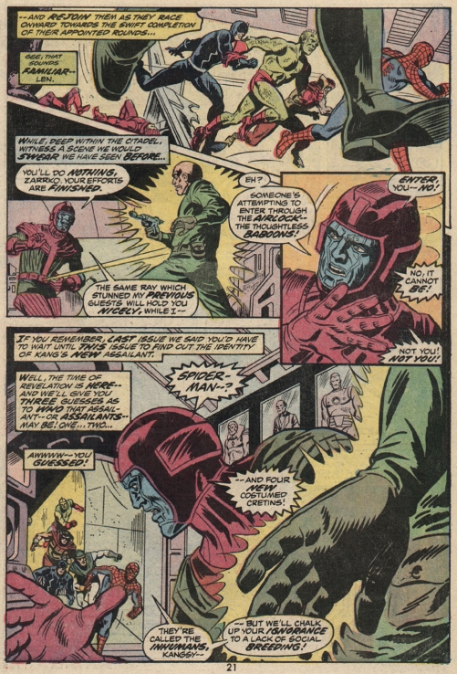 Po powrocie, urządzenie zostaje włączone i Spidey z Inhumans przenoszą się do XXIII wieku. Okazuje się, że zostali przeniesieni kilka minut przed ocknięciem się Spider-Mana w przyszłości i docierają w momencie, gdy Zarrko przylatuje do siedziby Kanga. Na powitanie bohaterów przybywa straż Kanga, która jednak w kilka chwil zostaje rozbita w pył. Kang sprzecza się z Zarrko, chce już go pojmać tak jak Avengers, gdy do pomieszczenia wbiegają Spider-Man i Inhumans, tajemniczy goście z Marvel Team-Up #10.