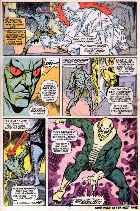 Pierwszym przeciwnikiem Spider-Mana i Kapitana Marvela zostaje Basilisk. W mitologii Bazyliszek to legendarny potwór, którego spojrzenie w oczy zamieniało ludzi w kamień. Analogicznym odpowiednikiem tego stworzenia jest właśnie Basilisk (prawdziwa tożsamość: Basil Elks, drobny złodziej). Są jednak dwie różnice. Po pierwsze, nie wystarczy samo spojrzenie w oczy Basiliska, jego ofiarę muszą uderzyć promienie wystrzeliwane z jego oczu. Po drugie, cel, w który trafił Basilisk, zamienia się w to, czego ten pragnie. Kamień, lód, piasek, szkło, ogień. Wedle życzenia. Całkiem ciekawy przeciwnik, lecz jego głupie postępowanie i kiepska motywacja przysporzyły mu sporo wrogów wśród czytelników.