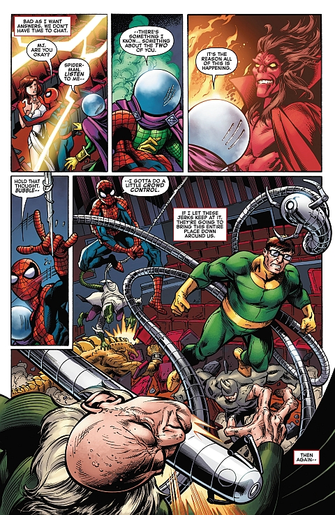 Rozmowę trójki przerywa odgłos pajęczego zmysłu. Pająk, skacząc, chwyta MJ, aby zapobiec jej zderzeniu z lecącym przez salę Rhino. Kiedy Peter pyta ukochaną, czy wszystko ok, Beck wyznaje, że wie o czymś, co dotyczy ich obojga i co jest powodem tego wszystkiego, co się dzieje. Spider-Man przerywa mu w pół zdania, twierdząc, że musi najpierw zadbać o to, by złoczyńcy nie obrócili tego miejsca w zgliszcza. Prosi Dr. Octopusa o opamiętanie, ale ten ciska nim, po czym składa Mysterio ofertę powrotu do Sinister Six w zamian za oddanie MJ i obietnicę, że nic się jej nie stanie. Wtedy Beck domyśla się, że Octaviusa nasłał Kindred.