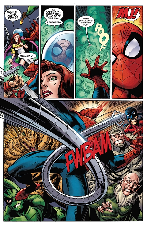 Z pomocą Mysterio przychodzą nieoczekiwanie Doktor Octopus i jego ekipa (Electro, Kraven, Lizard, Sandman), którzy przybyli zwerbować Quentina Becka do reaktywowanej Sinister Six. Pająk, który Octaviusa widział ostatnio w roli Superior Spider-Mana, zastanawia się, jakim cudem Otto wrócił do dawnej postaci. Podczas gdy dwie drużyny superłotrów toczą ze sobą bój, Mary Jane wyjawia Peterowi, że znała prawdę o Mysterio i pomagała mu, bo uwierzyła w jego moralną przemianę. Spider-Man pozostaje sceptyczny.
