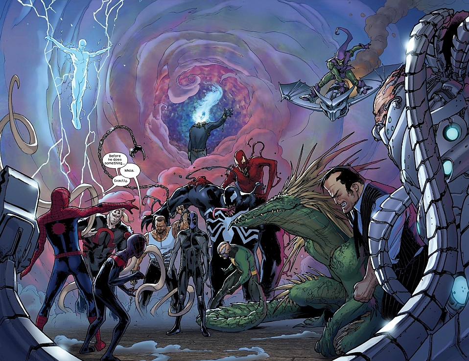 Dwóch Spider-Manów staje na wprost Mysterio. Bez zwłoki atakują, jednak zostają zepchnięci promieniem energetycznym do East River. Po wyjściu z rzeki pojawiają się przed nimi ich najwięksi wrogowie. Peter stwierdza, że są to tylko hologramy, jednak po tym, jak odczuwają ich ciosy, zmienia zdanie. Szybko orientuje się, że przeciwnik używa jakichś chemikaliów, które urealniają ich największe koszmary. Miles rzuca się na Mysterio i uszkadza go. Tymczasem kierujący awatarem prawdziwy Mysterio stwierdza, że uwięzi Spider-Mana w nieswoim wymiarze. Dochodzi do wybuchu awatara.