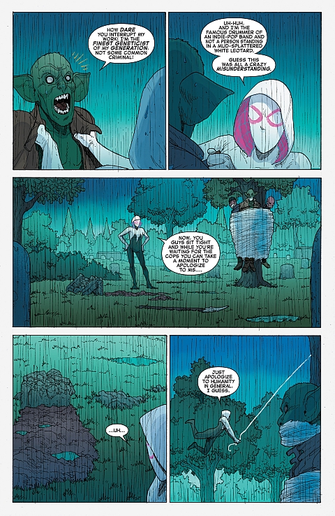 Battleworld. Arachnia. Mount Olivet Cemetery. W strugach deszczu Spider-Gwen rozprawia się Jackalem i jego pomocnikami, którzy bezczeszczą groby rzekomo dla dobra nauki. Kiedy nadjeżdża policja, bohaterka zostawia przywiązane do drzewa „hieny cmentarne” i w innej części cmentarza odwiedza groby… Gwen Stacy i jej ojca, kapitana George’a Stacy’ego.