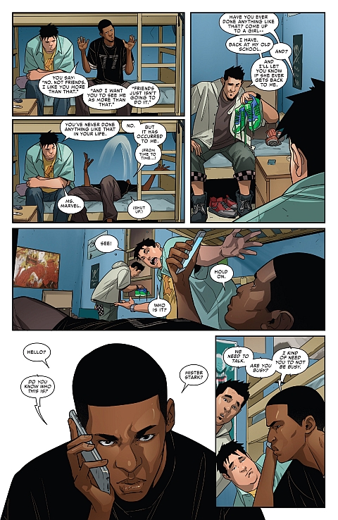 Pokój trójki chłopców w internacie. Ganke przeżywa, że trafił do „friend zone” w relacji z jedną dziewczyną. Obwinia o to swoją wagę. Pozostała dwójka pociesza go i zachęca, by dalej próbował swoich sił w kontaktach ze swoją sympatią. Nagle Miles odbiera telefon od Tony’ego Starka.