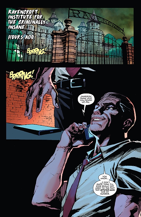 Kilka godzin wcześniej. Spider-Man rozmawia przez telefon z Johnem Jamesonem, który zapewnia go, że instytut Ravencroft został oczyszczony z personelu, aby wraz z Venomem mogli przechwycić uwięzionego w szpitalu Normana Osborna. Jak się okazuje, Jameson już wtedy był pod kontrolą Carnage’a, a strażnicy zostali brutalnie zamordowani.