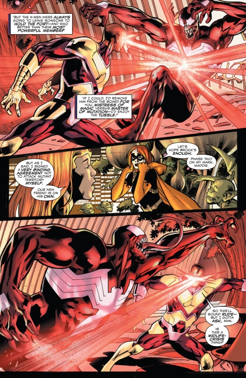 Teraźniejszość. Hallows’ Eve (Janine Godbe) obserwuje, jak zmanipulowany Brock w ramach zleconej mu misji zbliża się do Treehouse – siedziby X-Men na Manhattanie. Madelyne i Janine chcą wykorzystać go do swoich planów jako element dywersji. Eddie, już całkowicie oderwany od swojego dawnego „ja”, wdziera się do środka jako Venom. Okazuje się, że Treehouse pilnuje Synch – jedyny X-Man na miejscu, bo reszta wraz ze Spider-Manem jest zajęta walką z opętanymi przez demony przedmiotami w mieście.