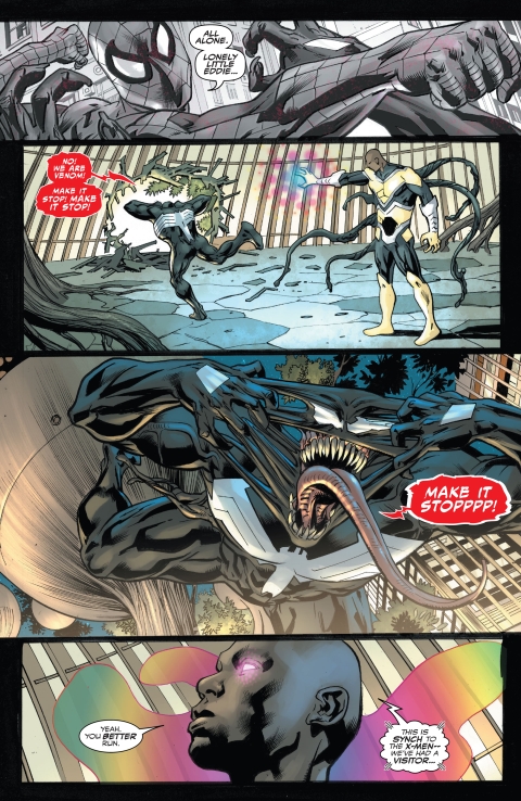 Dochodzi do walki. Synch drwi z Eddiego, ten wścieka się i atakuje. Gdy Hallows’ Eve włamuje się do magazynu, używając skrzydeł owada i kwasowej sieci, Synch odbiera alarm o kolejnym intruzie i przestaje się powstrzymywać – kopiuje moce Venoma i nokautuje go psychicznie oraz fizycznie. Brock zauważa, że nie słyszy już głosu symbionta w głowie. Synch przypuszcza, że ten jest przywódcą symbiontów, ale jego ludzki umysł nie wytrzymał tej mocy. Zdezorientowany i załamany Eddie ucieka w panice.