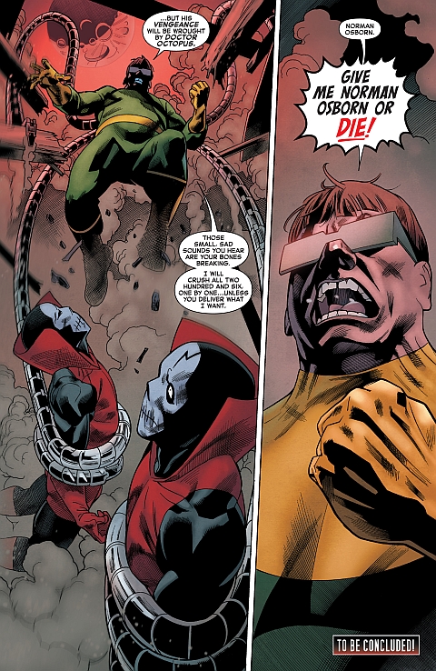 Później. Bracia Grimm, który zostali przekupieni przez Osborna z Earth-44145, pakują się, aby wyjechać z miasta i nie narazić się na gniew Octaviusa za zdradę, jakiej się dopuścili. Nagle sufit nad nimi zawala się i nakrywa ich były szef w dawnym wcieleniu Doktora Octopusa. Chwytając zdrajców mackami, grozi, że połamie im wszystkie kości, jeśli nie powiedzą mu, gdzie znajdzie Normana Osborna.