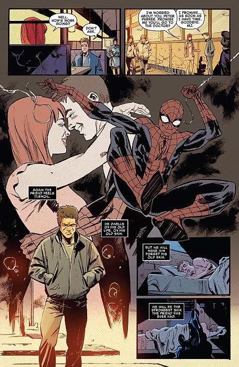 Peter budzi się dopiero o 5 po południu. Odwiedza go była dziewczyna, Mary Jane, i widząc, że coś go trapi, zabiera go na obiad. Wysłuchując jego problemów, doradza wizytę u lekarza. Symbiont, świadomy, że to spotkanie też poruszyło Parkera, ponownie zabiera śpiącego gospodarza na patrol, w czasie którego katuje zbirów, wspominając śmierć wujka Bena i Gwen Stacy. Peter budzi się w środku nocy z koszmaru. Zastaje Black Cat, która weszła do jego sypialni przez otwarte okno, choć rzekomo było zamknięte. Tłumaczy partnerce, że cierpi na bezsenność, mimo że śpi jak kamień. Cat ponawia apel o pójściu do lekarza.