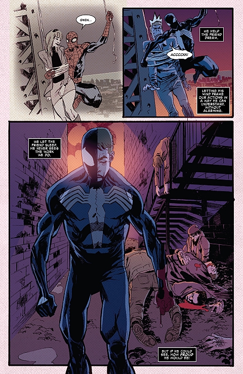 Później. Symbiont, widząc, że jego nosiciel boryka się z kłopotami osobistymi – niezadowoleniem Robbiego Robertsona z pracy fotografa, dociekliwością ciotki May i pretensjami Black Cat o spóźnialstwo na randki – przejmuje w nocy kontrolę nad jego ciałem, ale nie budzi go, aby jego umysł mógł odpocząć. Na patrolu czarny Spider-Man dopada złodzieja torebek i bije go tak, że uratowana starsza kobieta mdleje.