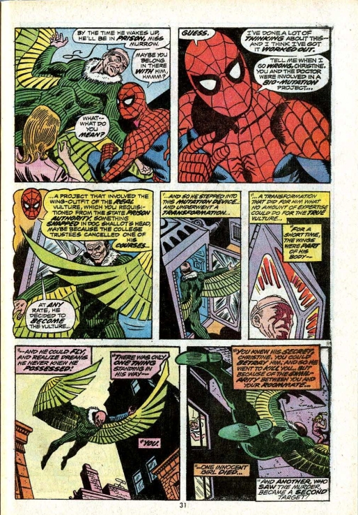 Największym zaskoczeniem jest postać głównego przeciwnika Spider-Mana. Nie tylko dowiadujemy się, dlaczego Vulture zabił dziewczynę z poprzedniego numeru oraz dlaczego interesuje się ESU i pracującą tam laborantką o imieniu Christine. Jesteśmy zszokowani samą tożsamością Vulture’a. Nie jest nim ani Blackie Drago, ani tym bardziej stary Adrian Toomes, tylko zupełnie inny człowiek, Dr. Clifton Shallot, naukowiec z ESU. Podobieństwo do Toomesa, które mogło zmylić czytelnika, zostało bardzo sprytnie wyjaśnione. Vulture III to ponadto pierwszy i jak dotąd jedyny Sęp, którego nadludzka siła wynika z genetycznej mutacji.
