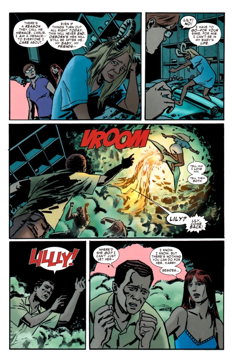 587 Park Avenue. Apartament Shelly’ego Hattona. Policja zabiera nieprzytomnego Tombstone’a. Mary Jane otrzymuje SMS-a od Petera z informacją, że dziecko jest bezpieczne w wieży Avengers. Po wyjściu policji Carlie próbuje przeprosić Lily za swoje zachowanie, jednak ta kompletnie ją rozumie, ponieważ w swojej ocenie stanowi zagrożenie dla wszystkich, w tym swojego dziecka. Lily wsiada na lotnię Menace i odlatuje ku rozpaczy Harry’ego, który dotarł do ich kryjówki.