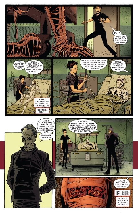 Cała historia zaczyna się od bardzo mocnego uderzenia. Kilka pierwszych kadrów nie pokazuje niczego nowego. Ot, Spider-Man przedrzeźnia kolejnego super-łotra i można pomyśleć, że kwestią czasu jest tylko to, jak da mu nauczkę i odda w ręce stróżów prawa. Nagle następuje coś zgoła odwrotnego, nieprzewidywalnego i aż przeciera się oczy ze zdumienia. Ja osobiście nie mogłem wyjść z szoku, gdy zobaczyłem, jak Spider-Mana płonie jak pochodnia, a cały wypadek sprowadza go na pogranicze życia i śmierci. Zaraz pomyślałem, że akcja przeniesie się do zaświatów, a ciężko ranny superheros przejdzie śmierć kliniczną. I znowu zaskoczenie, bo „przenosiny” sprowadzają go w inne miejsce, bo do bardzo specjalnego szpitala.