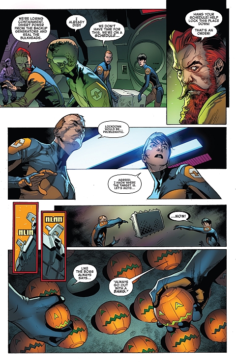 Co w takim razie przykuwa bardziej uwagę od partactwa Scorpio? Norman Osborn. Nikomu nie trzeba go chyba przedstawiać, pojawia się oczywiście na sam koniec, ujawniając się czytelnikowi jako zleceniodawca widocznych na początku najemników, którzy urządzili niezły sajgon w Lock Box. Swoją drogą wyjątkowe kiepskie zabezpieczenia miał ten kompleks, udowadniając, że chyba lepiej będzie, gdy pilnowaniem groźnych ”zabawek” zajmie się ostatecznie międzynarodowa agencja bezpieczeństwa, a nie jacyś tnący po kosztach prywaciarze – wniosek ”S.H.I.E.L.D. wróć!”.