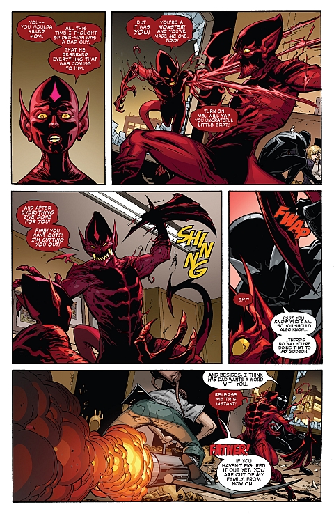 Stark Tower. Venom wpada do wieży. Mary Jane, myśląc, że to Osborn, aktywuje system obrony przeciwko symbiontom. Po chwili zjawia się Goblin, któremu dźwięki i ogień nic nie robią. Walczący z nim Venom przekonuje MJ, aby wyłączyła zabezpieczenia, mówiąc, że przybył jej na ratunek. Tymczasem do mieszkania May puka Normie, który twierdzi, że się zgubił. Zanim atakuje chcącą zadzwonić do jego matki kobietę, powstrzymuje go Superior Doctor Octopus, samozwańczy ochroniarz May. Chłopiec zmienia się w stwora (Goblin Childe) i rozrywa macki Octaviusa.