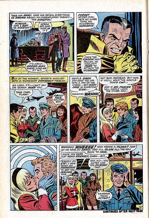 Schemer przesłuchuje jednego z byłych pracowników Kingpina. Jeniec zgadza się opowiedzieć wszystko, co wie o swoim szefie, ponieważ nie znajduje powodu do bycia lojalnym wobec niego. W tym czasie Peter, Gwen, Harry i Mary Jane żegnają Flasha, który odlatuje samolotem na misję do Wietnamu. Kiedy Peter odprowadza Gwen do domu, samochód potrąca cieżarówkę, która przewraca się na zakochaną parę. Peter ratuje Gwen przed śmiercią, ale dziewczyna traci przytomność i zostaje zabrana do szpitala.