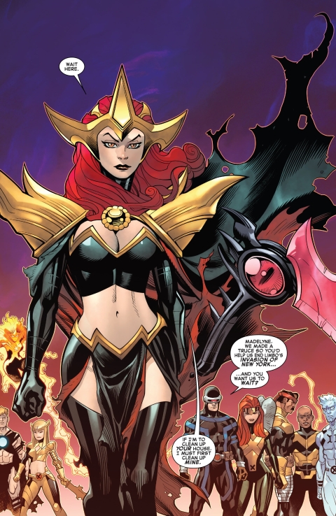 Kolejnym zaskoczeniem jest przewrót w Limbo. Nie tyle to, że do niego doszło (bo jak można by pociągnąć jeszcze motyw inwazji demonów na NYC i pokazać finałową bitwę), ile kto go przeprowadził. Niby nikt nie powinien być zszokowany zachowaniem konspiratora, ale należy oddać scenarzyście, że zastosował sprytny zabieg, bo najpierw zostawił tę postać u boku Goblin Queen, a potem dał jej wbić królowej nóż w plecy.
