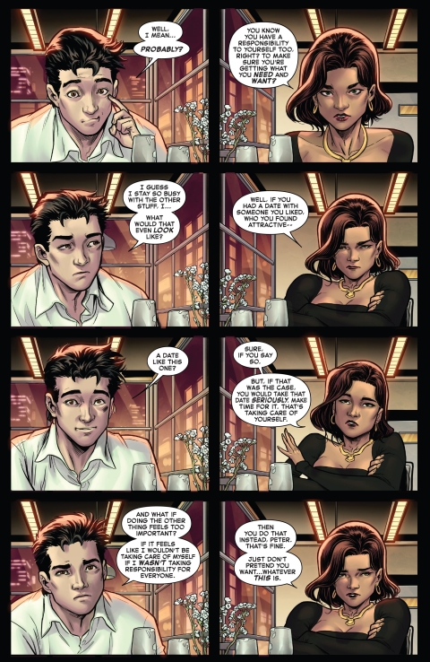 Scenariusz komiksu, wolny od walk bohatera w kostiumie Spider-Mana (jedna zostaje tylko wspomniana), opiera się na dialogu Petera i Shey w restauracji w trakcie ich trzeciej randki (z krótkim wyjściem Parkera na zewnątrz w celu zażegnania pewnego kryzysu, o czym za moment). Jest to umiejętnie poprowadzona rozmowa, mocno trzymająca się ziemi, a zarazem wciągająca. Ze strony Shay padają rzeczowe argumenty o sednie związku, a i Peter pokazuje się od strony dojrzałego, a nie infantylnego gościa.