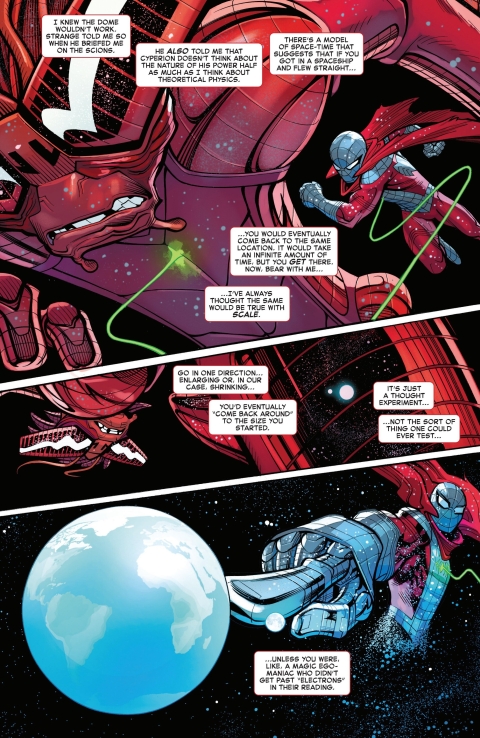 Podczas walki Cyperion wykorzystuje swoje moce, aby rozdzielić ciało Spider-Mana na nieskończoną liczbę fragmentów w różnych wymiarach. Peter, łącząc swoją wiedzę z zakresu fizyki i nowo nabyte umiejętności magiczne, powiększa się do nieskończonych rozmiarów, co pozwala mu dosięgnąć Cyperiona i pokonać go. Niestety, sukces ten kosztuje go kolejną śmierć i zużycie drugiej z ośmiu magicznych Trzcin Raggadorra.