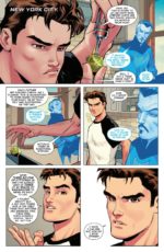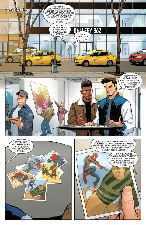 Później. Gallery 862. Randy Robertson pomaga Peterowi wybrać zdjęcia na wystawę, którą pomaga im zorganizować właścicielka galerii Alice, podczas gdy dwójka Scionów – bliźniacze rodzeństwo Callix i Cyra – obserwuje Parkera z ukrycia. Callix, zniecierpliwiony oczekiwaniem, postanawia zaatakować Petera, mimo ostrzeżeń Cyry, że może to zakończyć się niepowodzeniem. Nieco później Peter, pomagając cioci May w centrum F.E.A.S.T., przekazuje jej czek od Normana Osborna na organizację dnia społeczności. May przypomina mu o zaplanowanej na wieczór kolacji z Shay w jej mieszkaniu.