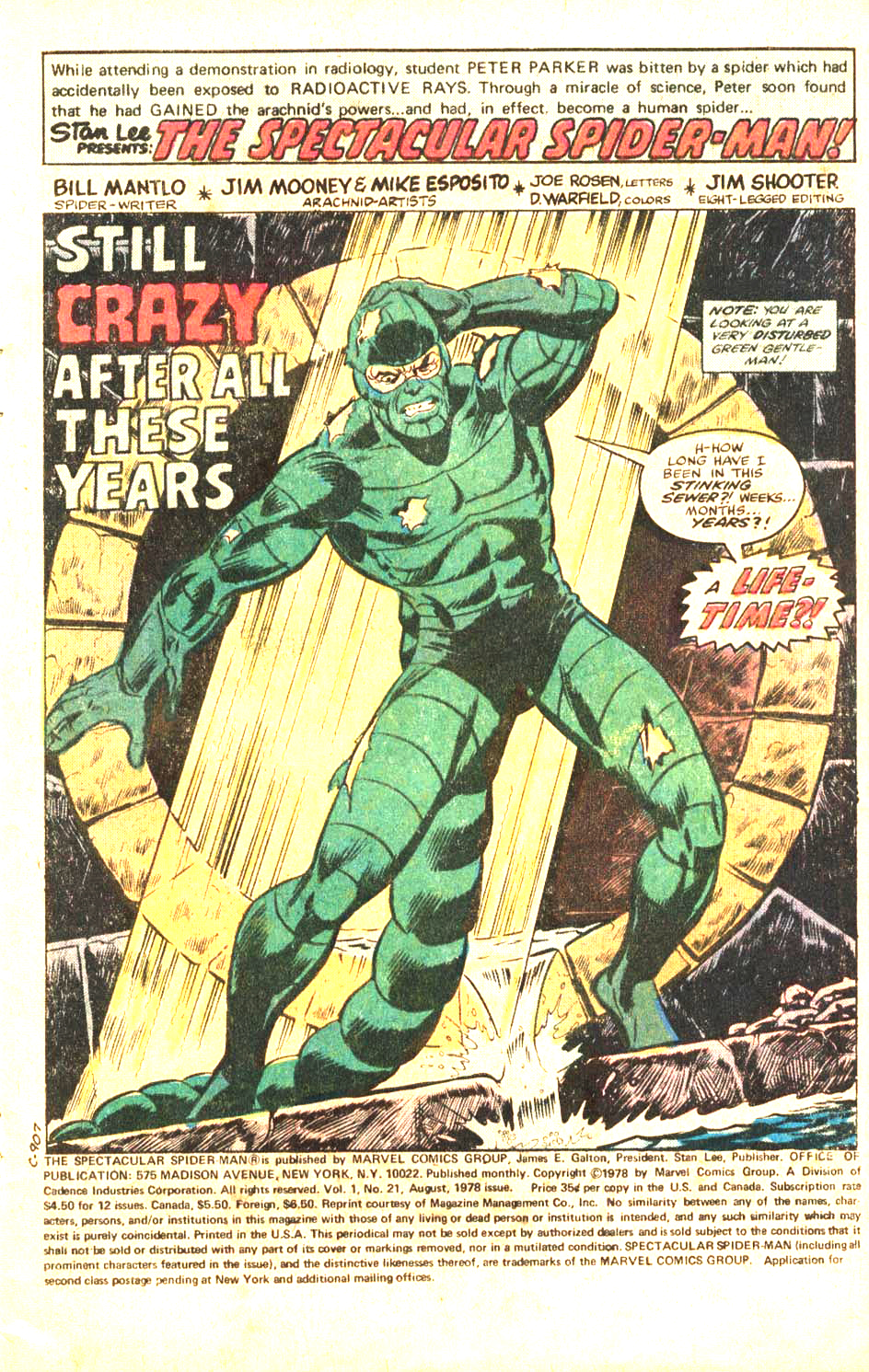 To już dwudziesty pierwszy numer Spectacular Spider-Mana. Pierwszy raz w tym tytule widzimy Scorpiona, który wyszedł z kanałów by oberwać od Pająka. Niby stał się silniejszy, a mimo to Spider-Man nawet nie potrzebował pajęczyny by go powstrzymać. Trochę zdziwiło mnie to jak Pająk mógł zgubić pas z zapasową siecią. Ponadto dowiadujemy się, że Sha Shan znalazła pracę, MJ wciąż nie chce wyjść za Petera, May wciąż leży w szpitalu i w końcu, Holly oficjalnie rzuciła Hectora.
